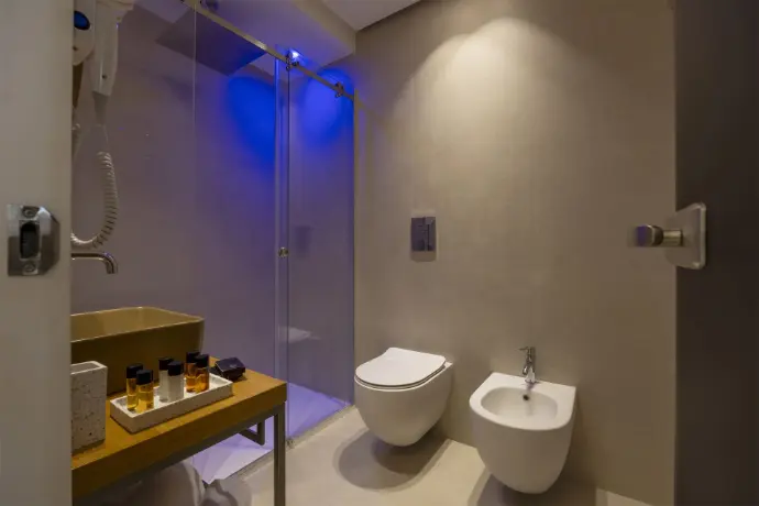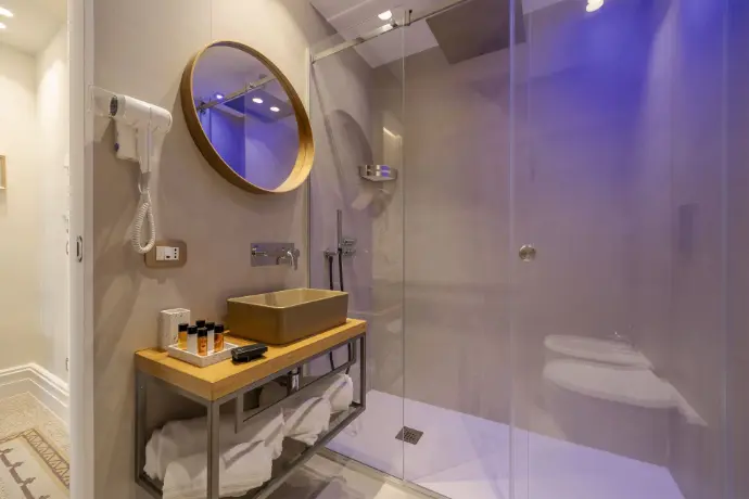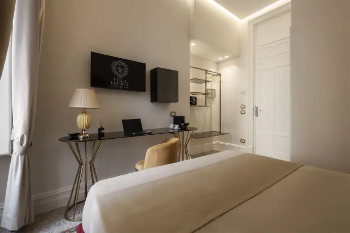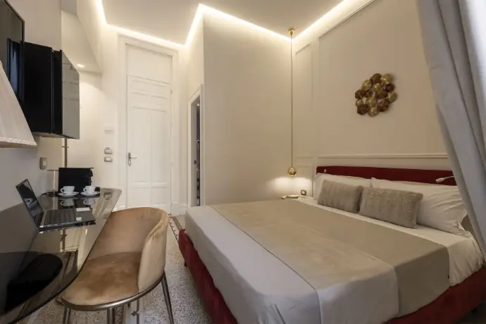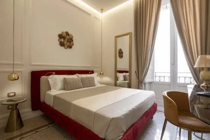 Camera con letto matrimoniale, un perfetto equilibrio tra comfort ed eleganza. Ideale per coppie, offre un rifugio intimo e raffinato nel cuore di Palermo. Ogni dettaglio è pensato per garantire il massimo del relax, creando un ambiente accogliente dove godersi il benessere durante il soggiorno.