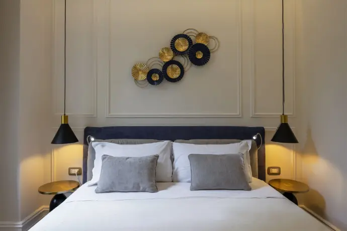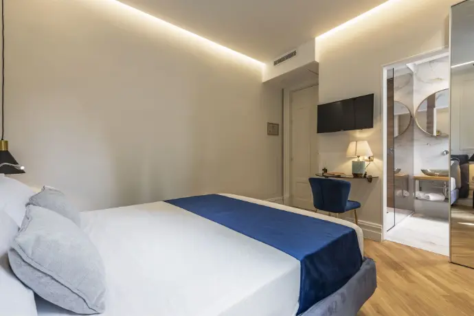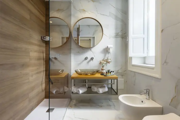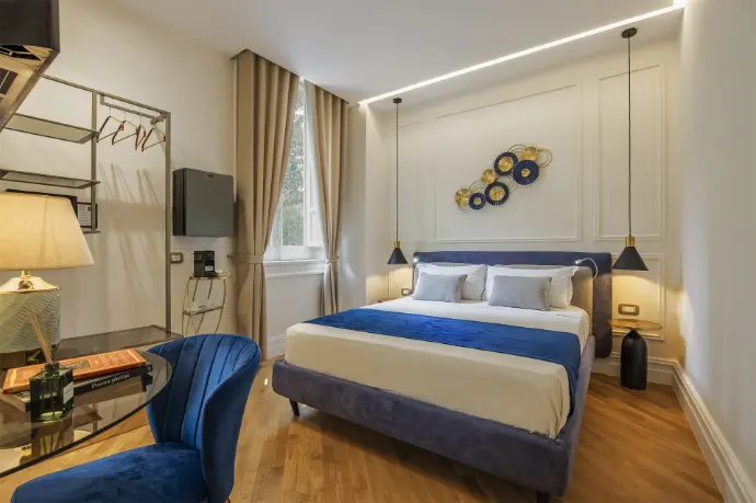 Camera Deluxe con letto matrimoniale, dotata di una spaziosa doccia e una splendida vista sul giardino. Un ambiente tranquillo e accogliente, ideale per chi cerca un soggiorno rilassante. La combinazione di comfort, eleganza e bellezza naturale crea l'atmosfera perfetta per un’esperienza unica.