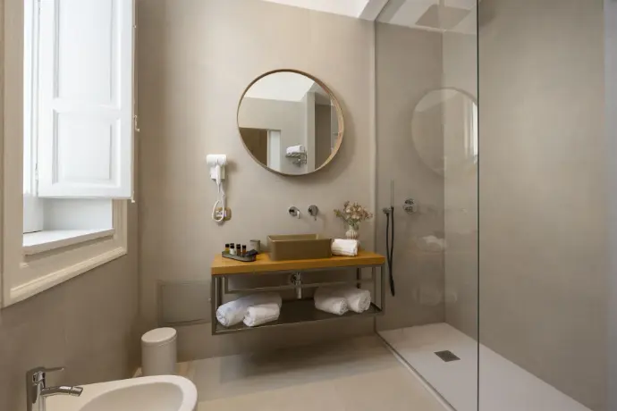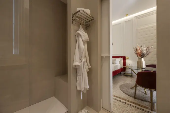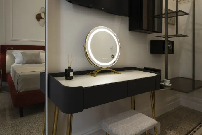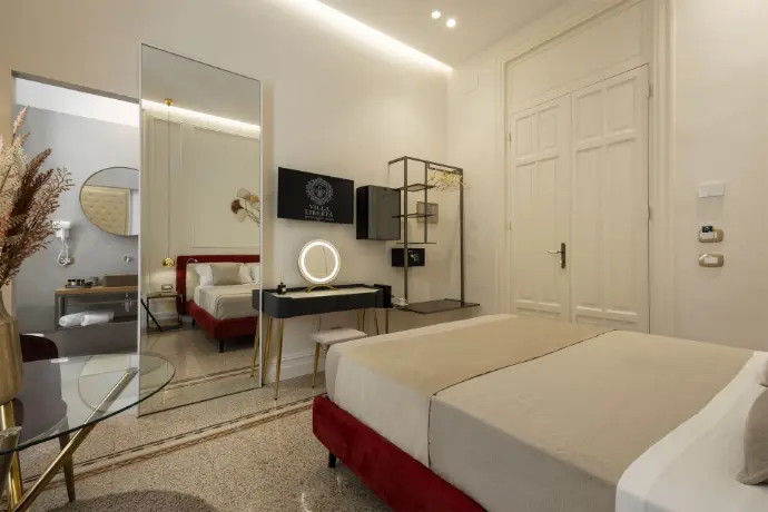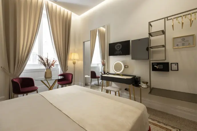 Deluxe Queen al primo piano, con tavolino in vetro e sedie, perfetta per coppie in cerca di un angolo di serenità o per chi lavora e ha bisogno di una postazione tranquilla. L’ambiente elegante e confortevole offre un rifugio ideale per rilassarsi o concentrarsi, garantendo privacy, comfort e un’atmosfera accogliente in ogni momento.