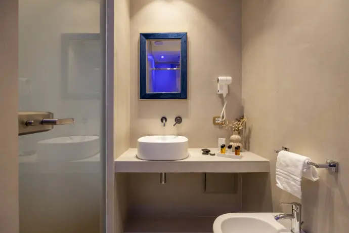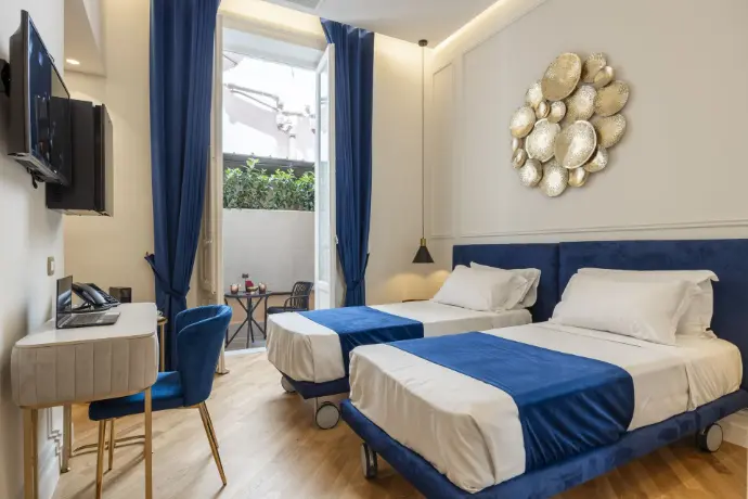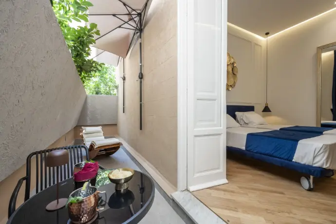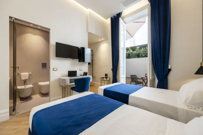 Camera dotata di due letti singoli (Twin), al piano terra, ideale per chi preferisce letti separati o non viaggia in coppia. Dotata di un piccolo terrazzino, bagno privato, aria condizionata, minibar, TV e macchina da caffè, offre comfort e comodità. Perfetta per un soggiorno rilassante, unendo privacy e praticità nel cuore di Palermo.
